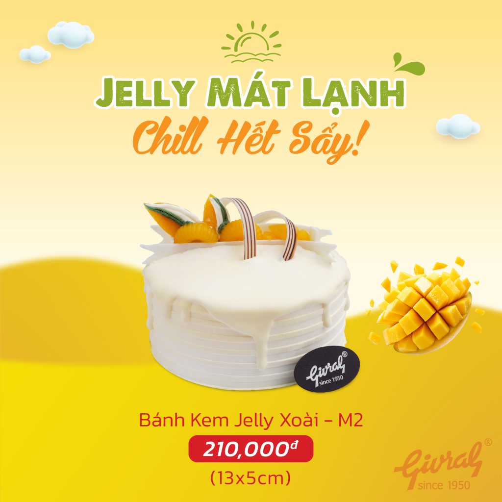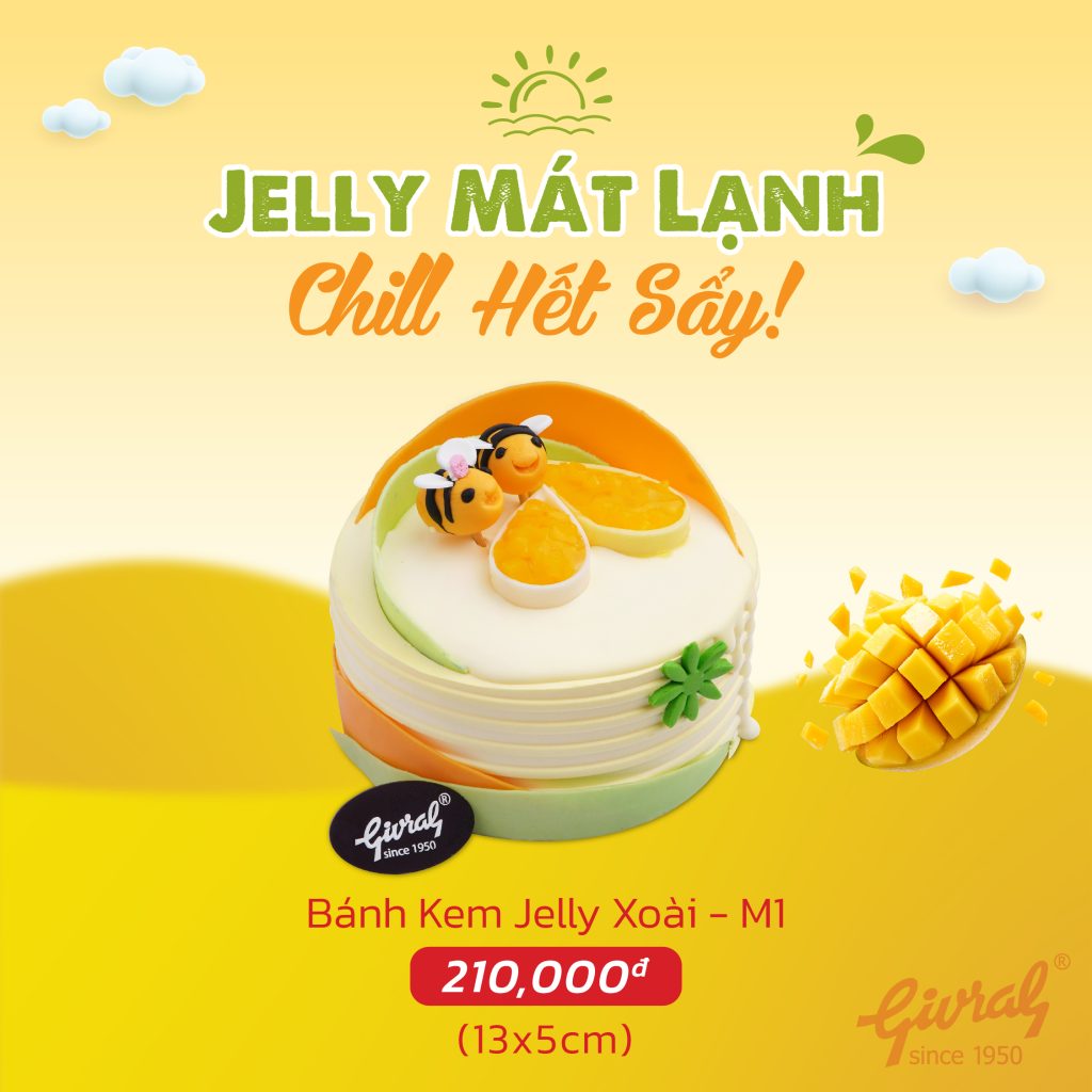 Bánh Kem Jelly Xoài – Mát lạnh với từng lớp jelly trong veo, kết hợp cùng xoài chín vàng ngọt dịu và kem tươi mềm mịn. Nhẹ nhàng, tươi mới – như một buổi trưa đầy nắng tại vùng nhiệt đới.