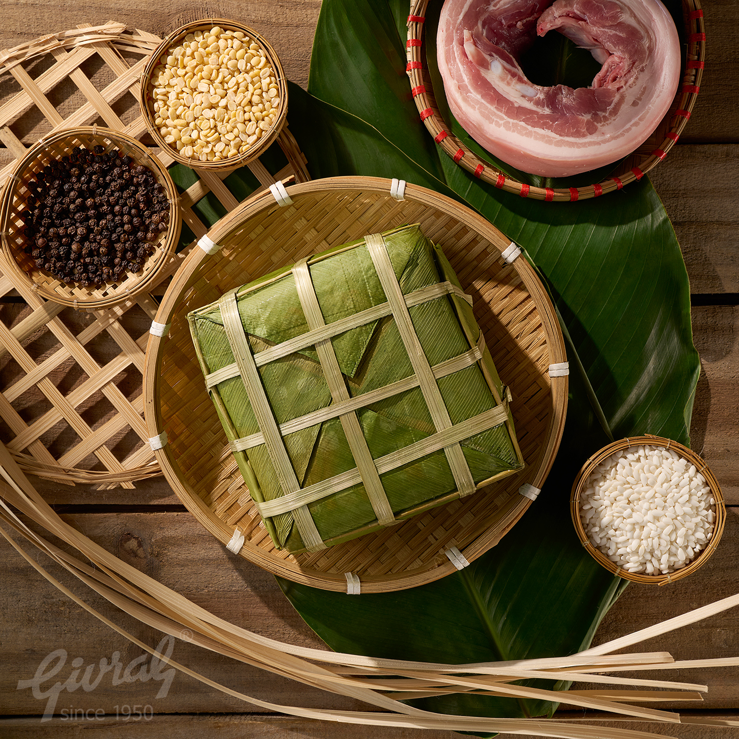 Thành phần: Gạo nếp, Đậu xanh, Thịt heo, Dầu thực vật tinh luyện, Nước cốt lá riềng, Nước mắm, Hạt nêm, Tiêu, Muối.
